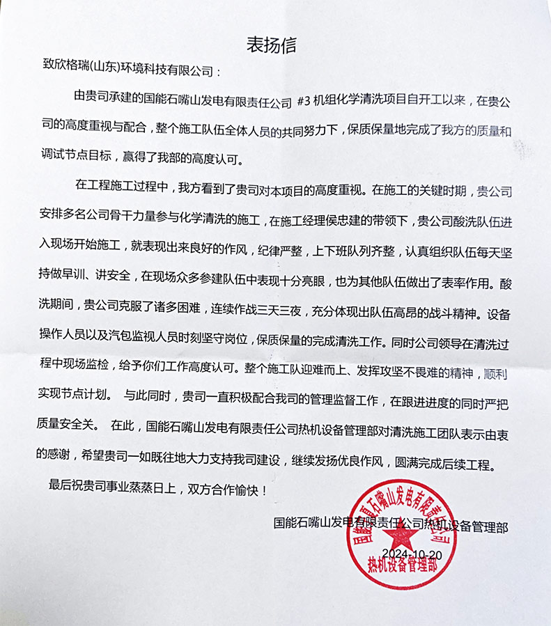 國能石嘴山發(fā)電有限責(zé)任公司的表揚(yáng)信,對(duì)欣格瑞公司的施工團(tuán)隊(duì)給予了高度評(píng)價(jià):“貴公司酸洗隊(duì)伍表現(xiàn)出來良好的作風(fēng),紀(jì)律嚴(yán)整,上下班隊(duì)列齊整,認(rèn)真組織隊(duì)伍每天堅(jiān)持做早訓(xùn)、講安全,在現(xiàn)場眾多參建隊(duì)伍中表現(xiàn)十分亮眼,也為其他隊(duì)伍做出了表率作用。酸洗期間,貴公司克服了諸多困難,連續(xù)作戰(zhàn)三天三夜,充分體現(xiàn)出隊(duì)伍高昂的戰(zhàn)斗精神。公司領(lǐng)導(dǎo)在清洗過程中現(xiàn)場監(jiān)檢,給予你們工作高度認(rèn)可。在此,國能石嘴山發(fā)電有限責(zé)任公司熱機(jī)設(shè)備管理部對(duì)清洗施工團(tuán)隊(duì)表示由衷的感謝!”