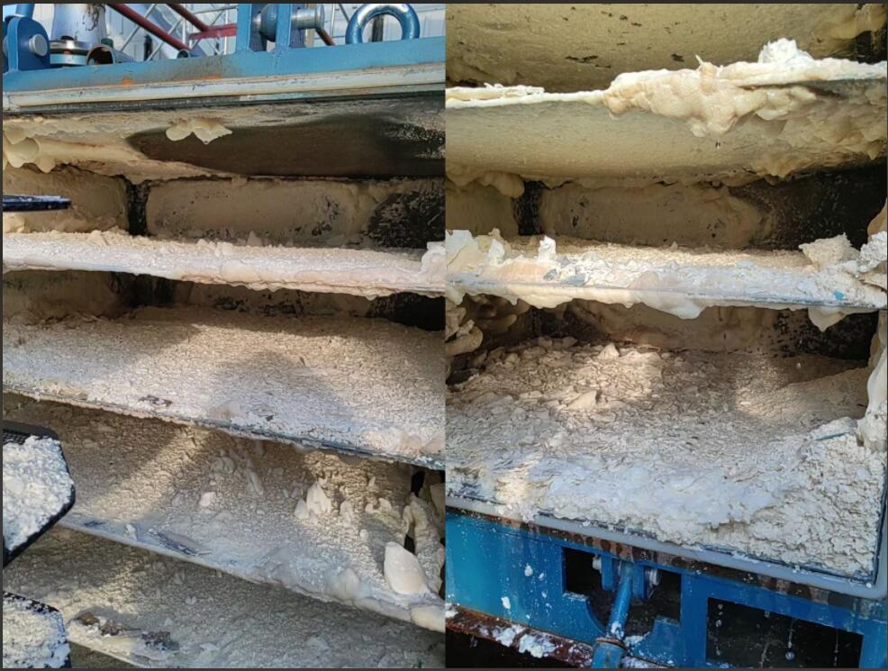 經(jīng)了解瑞陽化工循環(huán)水系統(tǒng)采用自來水作為補水,循環(huán)水排水受限,經(jīng)過多輪深入地技術(shù)交流與研討,瑞陽化工選擇欣格瑞公司的SGR系統(tǒng)電化學(xué)設(shè)備。設(shè)備內(nèi)置由特殊材料制作的陰陽極板,通電后電解水使陰極具備除垢;陽極具備殺菌、滅藻功能,能較好的解決循環(huán)水的結(jié)垢、腐蝕、菌藻等問題,實現(xiàn)循環(huán)水的高濃縮倍數(shù)或者近零排運行,是一種顛覆性的循環(huán)水處理技術(shù)。目前,該項目設(shè)備已順利安裝并運行,運行效果顯著。設(shè)備內(nèi)部吸附沉積了大量水垢,大幅降低了循環(huán)水中成垢離子濃度,增強了循環(huán)水系統(tǒng)的穩(wěn)定性與可靠性,實現(xiàn)了無藥劑添加下的高濃縮倍數(shù)安全運行,減少了一次水的消耗和污水排放,為瑞陽化工的生產(chǎn)運營提供了堅實的保障。