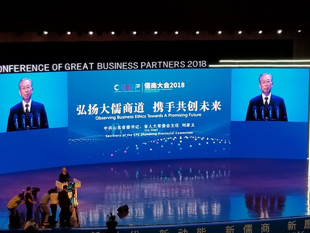 2018年9月28日上午,在美麗的泉城濟南,山東會堂眾商云集、智者薈萃、群賢畢至。以“大儒商道、至誠天下”為宗旨,以“新時代、新動能、新儒商、新愿景”為主題的“儒商大會2018”在這里隆重開幕,來自國內(nèi)外工商界、科技界、教育界、文旅界、醫(yī)療衛(wèi)生界、金融界、海外社團及僑界、新生代和青年創(chuàng)業(yè)者等1120名嘉賓齊聚一堂,共敘儒風鄉(xiāng)情,共商合作大計,共享發(fā)展機遇。