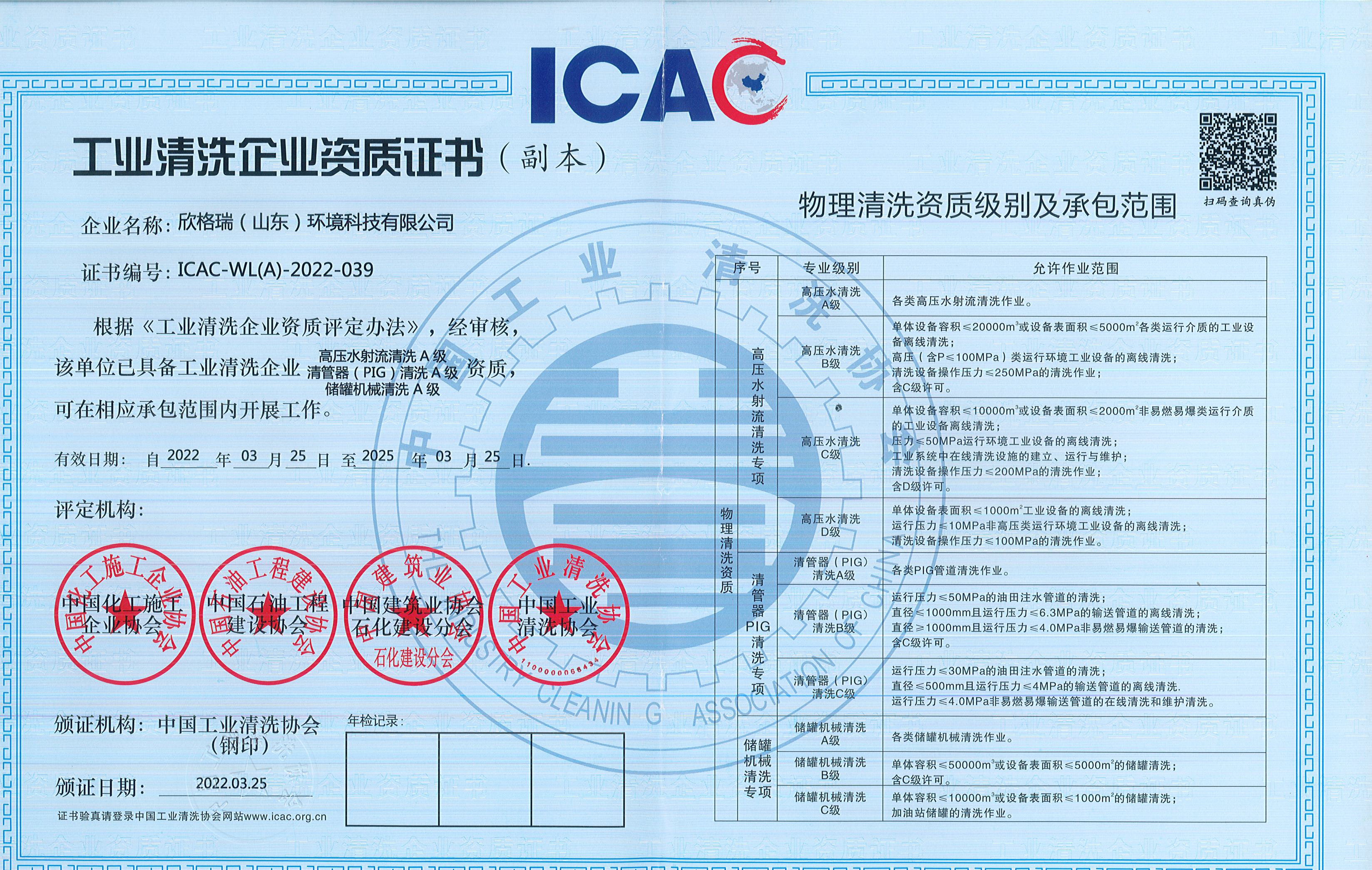 工業(yè)清洗高壓水清洗、Pig清洗、儲(chǔ)罐清洗A級(jí)資質(zhì)